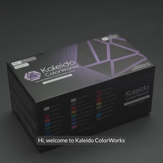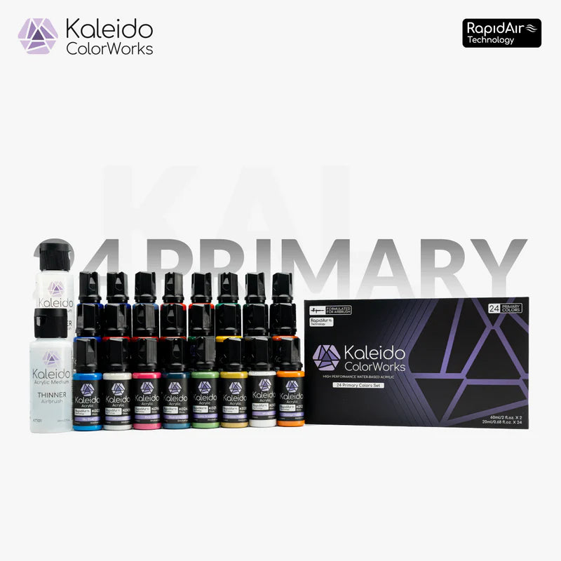 Kaleido Colorworks RapidAir™ Series er en førsteklasses vandbaseret akrylmaling, udviklet til jævn og højtydende airbrush-sprøjtning. Malingen er fremstillet med en miljøvenlig, giftfri og opløsningsmiddelfri formel og leveres fabriksfortyndet, klar til brug direkte fra flasken eller let at fortynde efter behov.