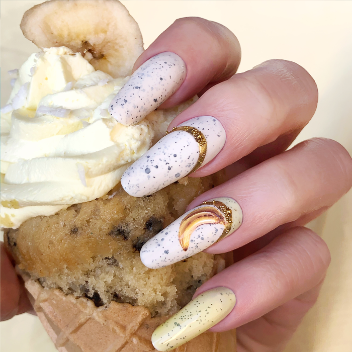Banana Cake indeholder partikler af holografisk folie samt fine sorte korn, som giver negledesignet en markant 3D Oreo-effekt. Den lette dispersion gør det muligt at male og tilføje ekstra dekorationer.