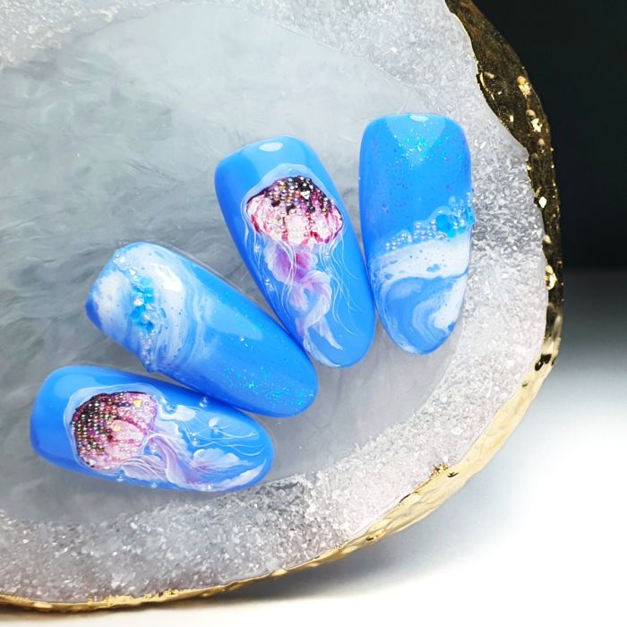 Ocean 286 gelpolish har en intens blå nuance, selvom den ikke er neon. Den friske farve klæder solbrune hænder perfekt og kan bruges til manicure til enhver anledning.
