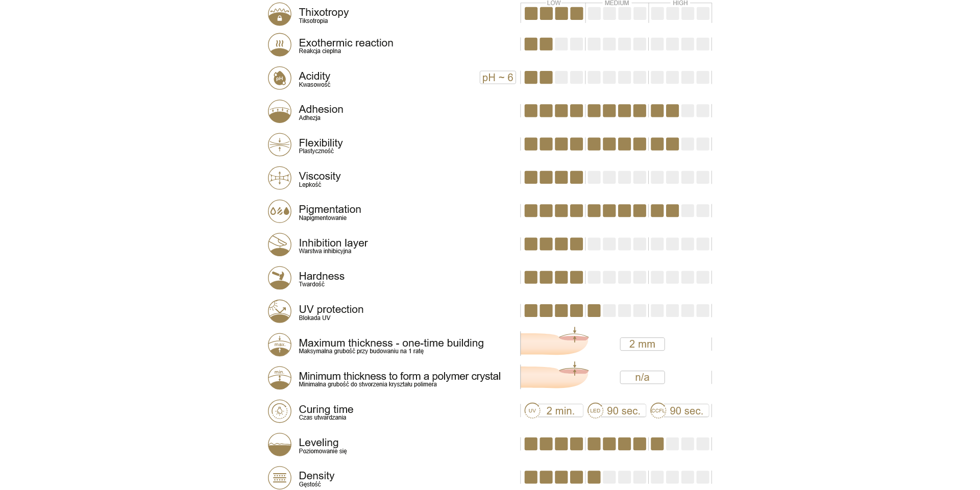 - Produktet har en meget stærk vedhæftning, der er kendetegnet ved høj vedhæftning til den naturlige negl, hvilket gør risikoen for luftlommer og løsning af produktet fra den frie kant eller i neglebåndet (såkaldt løft) næsten nul, uanset kundens neglestruktur og den problematiske hyperhidrose på hænderne.