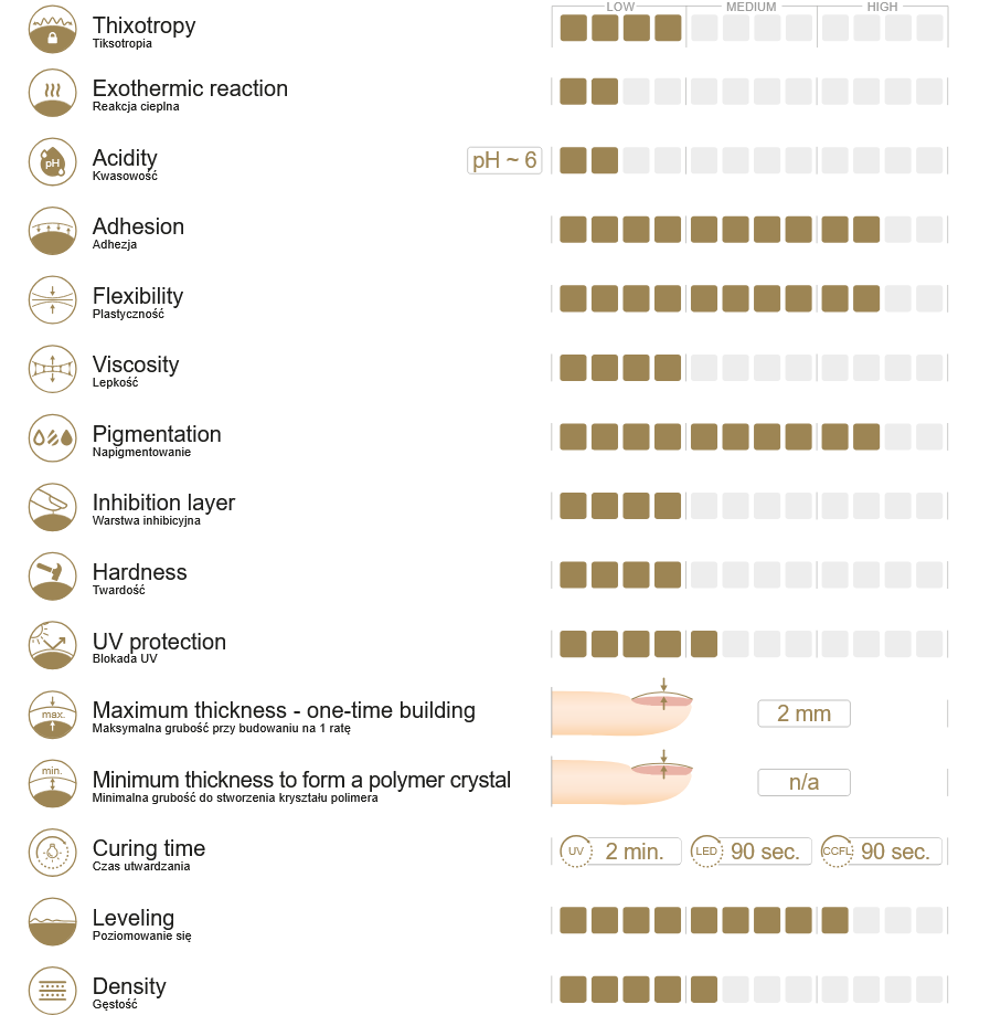 Produktet har en meget stærk vedhæftning, der er kendetegnet ved høj vedhæftning til den naturlige negl, hvilket gør risikoen for luftlommer og løsning af produktet fra den frie kant eller i neglebåndet (såkaldt løft) næsten nul, uanset kundens neglestruktur og den problematiske hyperhidrose på hænderne.