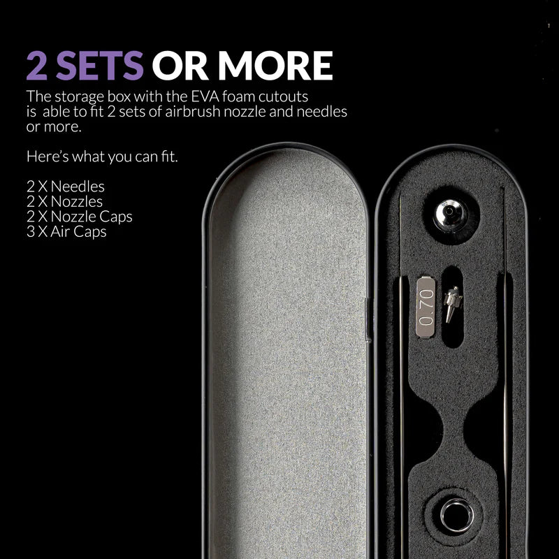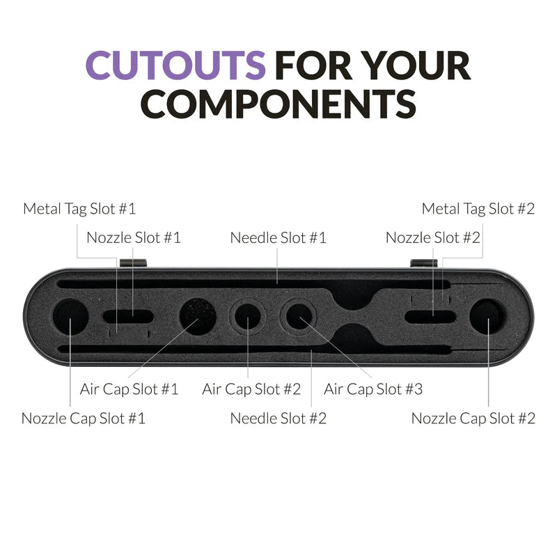 Opbevaringsboksen har runde rum med udtageligt EVA-skum, så du nemt kan tilpasse og fastgøre de fleste airbrush-dyser og air caps. Det sikrer en tæt og sikker pasform for dine komponenter.