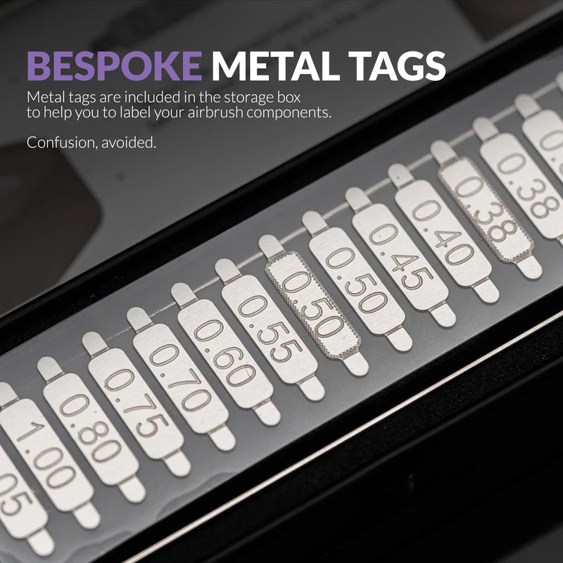 Medfølgende metaltags gør det nemt at mærke og organisere dine airbrush-dele, så du hurtigt kan identificere dem. Farvel til forvirring – goddag til orden på arbejdsbordet.