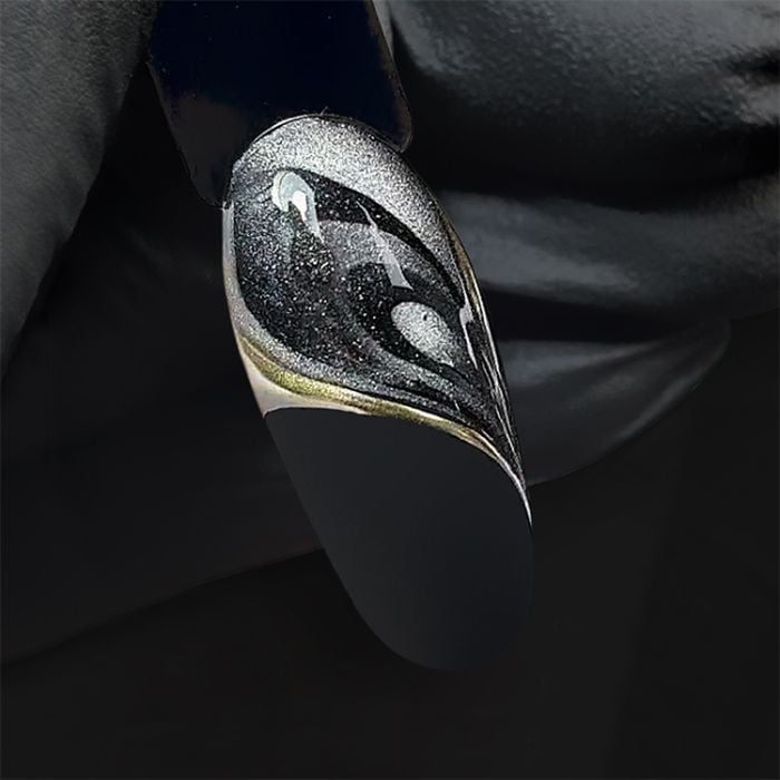 Den magnetiske Cat Eye gel polish gør det muligt at skabe en spændende kombination af sort og en metallisk stribe på neglene, som giver en smuk og dyb cat eye-effekt med masser af karakter