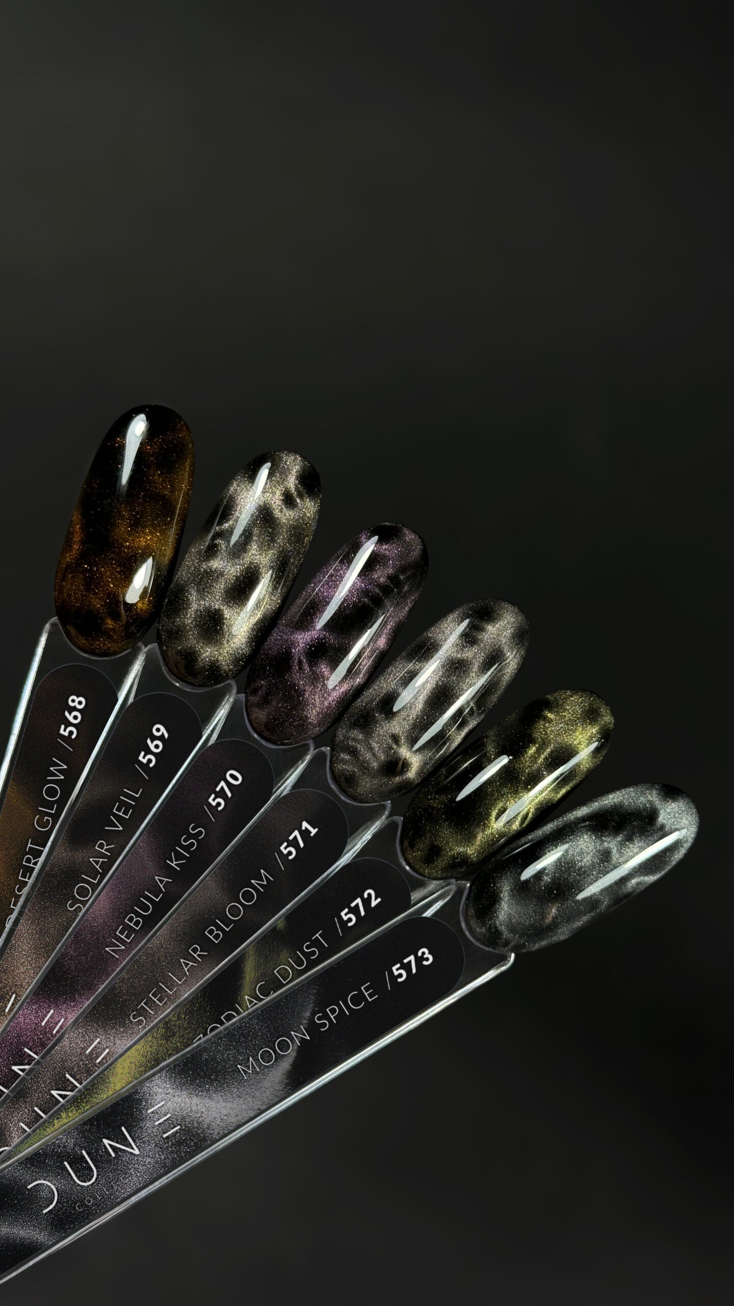 DUNE-kollektionen fra Slowianka Nail Trends er en serie af seks næste generations transparente gel-lakker beriget med ultrafint magnetisk pulver, der giver en cat-eye-effekt og tredimensionelle lysrefleksioner. Hver nuance – fra den varme Desert Glow, den sølvfarvede Solar Veil, den kosmiske Nebula Kiss, den elegante Stellar Bloom, den hypnotiske Zodiac Dust til den røgede Moon Spice – tilbyder ubegrænsede art muligheder: den kan bruges alene, over en farvet base, i en ombre eller kombineret med Flash Cat Eye-kollektionen. Takket være den transparente formel bliver den ekstra smuk over mørke baser. Dette er en kollektion til neglekunstnere, der ønsker at kombinere elegance med en moderne, futuristisk finish.