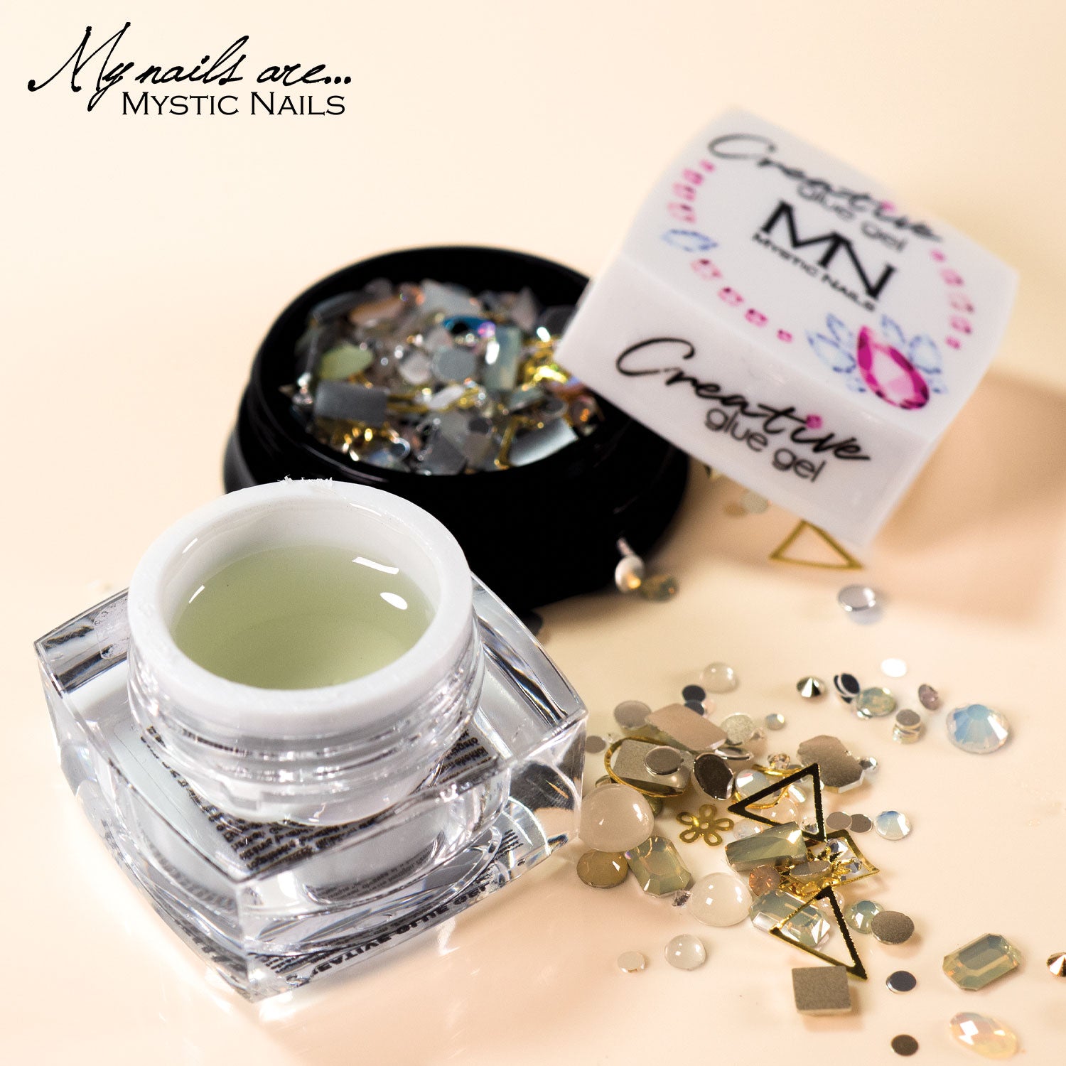- Alle former og størrelser af rhinesten og neglekunstgenstande kan let påsættes, fordi gelen omgiver neglekunstartiklen fra bunden