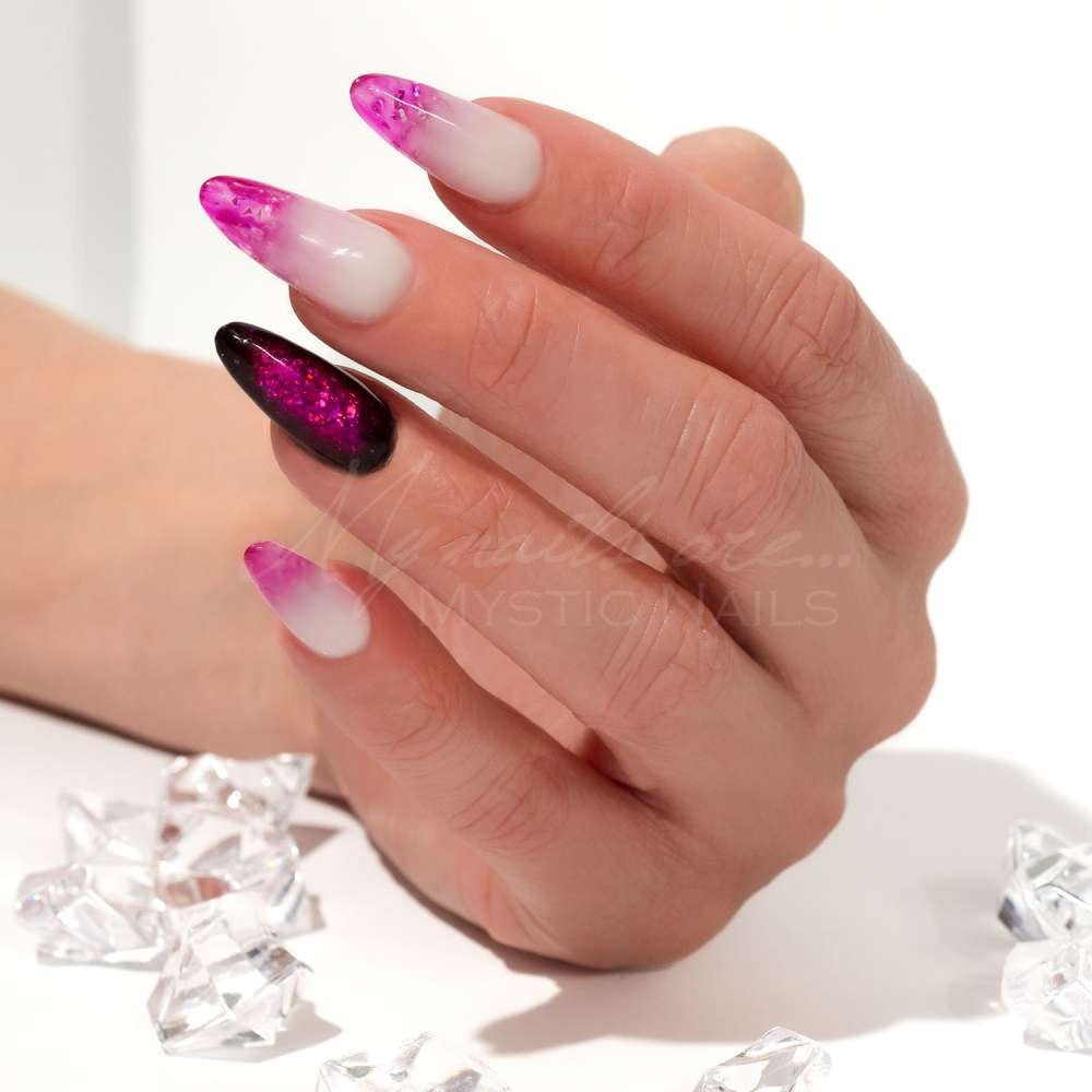 Gel Polish Glass tilføjer endnu en mulighed til neglekunstens verden. Du kan skabe et mystisk, gennemsigtigt, farvet lag ved blot at påføre det på alle klare underlag. Du kan dække den med enhver af Mystic Nails topgeleer