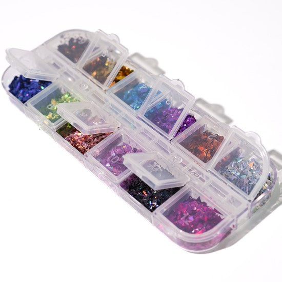 Dette sæt indeholder to absolut smukke effekter: Aurora flakes, der giver en drømmende, lys-effekt på lyse eller gennemsigtige baser, og så metal flakes, som giver stærk kontrast og dybde på mørkere nuancer. Selv én enkel flake skaber en iøjefaldende effekt.