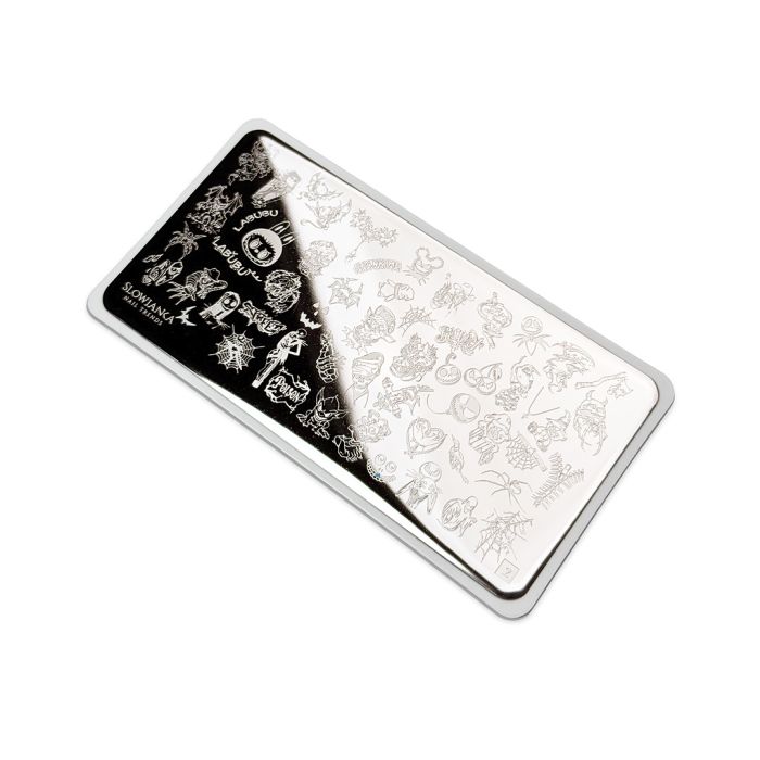 Dette neglestempel er en sand fornøjelse for Halloween-fans! Du finder kranier, edderkopper, hekse, spøgelser, zombier, vampyrer og andre gyserfilmmotiver. Perfekt til dristige, originale og mørke neglekunstdesigns – perfekt til Halloween-sæsonen.