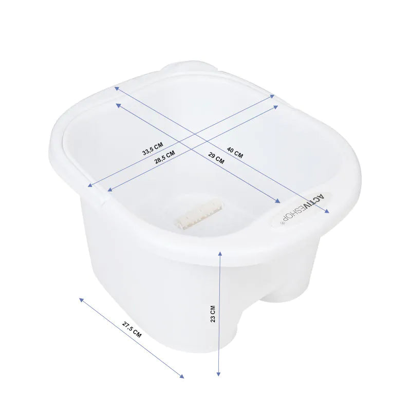 Skål/spand til at iblødsætte fødderne før pedicure. Lavet af plastik med profileret bund og massageruller. Udstyret med et håndtag til at bære og nemt hælde indholdet ud efter brug.