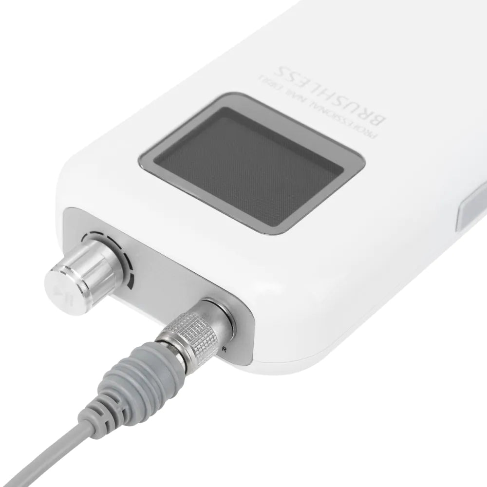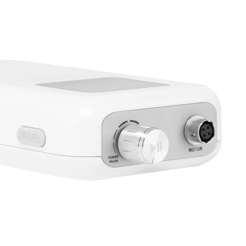 Knappen giver mulighed for jævn justering af hovedets hastighed og kan nå op til 35.000 omdrejninger i minuttet, hvilket giver nem tilpasning og komfort under forskellige behandlinger. Ved at trykke på knappen kan du straks stoppe og genoptage el-filen (pausefunktion), hvilket giver dig fuld kontrol over arbejdet. Praktiske knapper placeret på siderne giver mulighed for hurtigt skift til fodpedal og ændring af rotationsretningen, hvilket yderligere gør det nemmere at tilpasse den til forskellige anvendelser. Displayet viser information om rotationsretning, batteristatus, aktivering af fodpedal og aktiv pause. Derudover er filen udstyret med overbelastningsbeskyttelse, som beskytter motoren mod overophedning, hvilket sikrer større arbejdssikkerhed og udstyrets levetid.