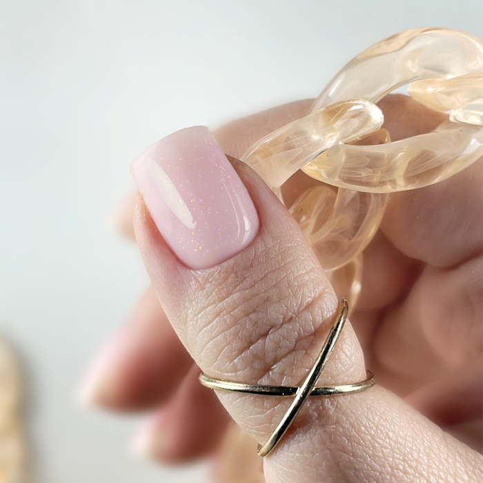 Typisk, pudderpink i en delikat og meget lys, nude version. Basen indeholder runde, mellemstore glimmerpartikler, farvet kun på den ene side, takket være hvilket de smukt skinner i ferskenguld eller pink, afhængigt af lysvinklen, hvilket giver indtryk af bevægelse i midten af basen. Effekten er ikke overdrevent intens, og basen er meget delikat. Fantastisk for Baby Boomer.