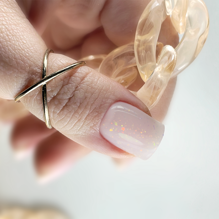 Fantastisk og subtil, meget lys og naturlig, mælkehvid nuance. Den blender perfekt med den naturlige negl ved neglebåndslinjen. Indeholder folieflager, der skinner i forskellige farver: akvamarin, guld, kobber, lilla, pink og lavendel. Fordi basen er mindre pigmenteret, er glansen helt sikkert stærkere. Produktet stivner naturlige negle kraftigt, det er perfekt til medium hårde og bløde, sprøde negle, der kræver styrke.